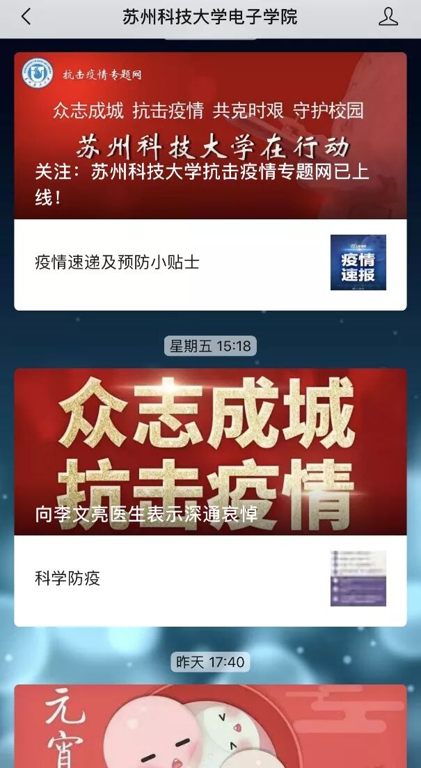 电子学院在疫情防控期间按照学院党委指示,辅导员对全院学生逐个进行排查,掌握每个同学的情况,对在疫区和接触过疫区的同学每天电话实时跟踪了解。高年级班级成立以班长、团支书和学生分别负责的5-6个小组,每天上报班级每位同学的情况;低年级每个班级建立表单云文档,各个宿舍舍长作为负责人,辅导员通过表单云文档了解每个同学状况。各年级辅导员通过微信、QQ群、学院微信公众号将教育厅、学校的最新消息和各种辟谣信息第一时间发送给每位同学,积极传播正能量。部分学生党员还通过原创诗歌为自己、为家人、为奋战在一线的医护人员和普通工作者,献上我们最真挚的祝福。