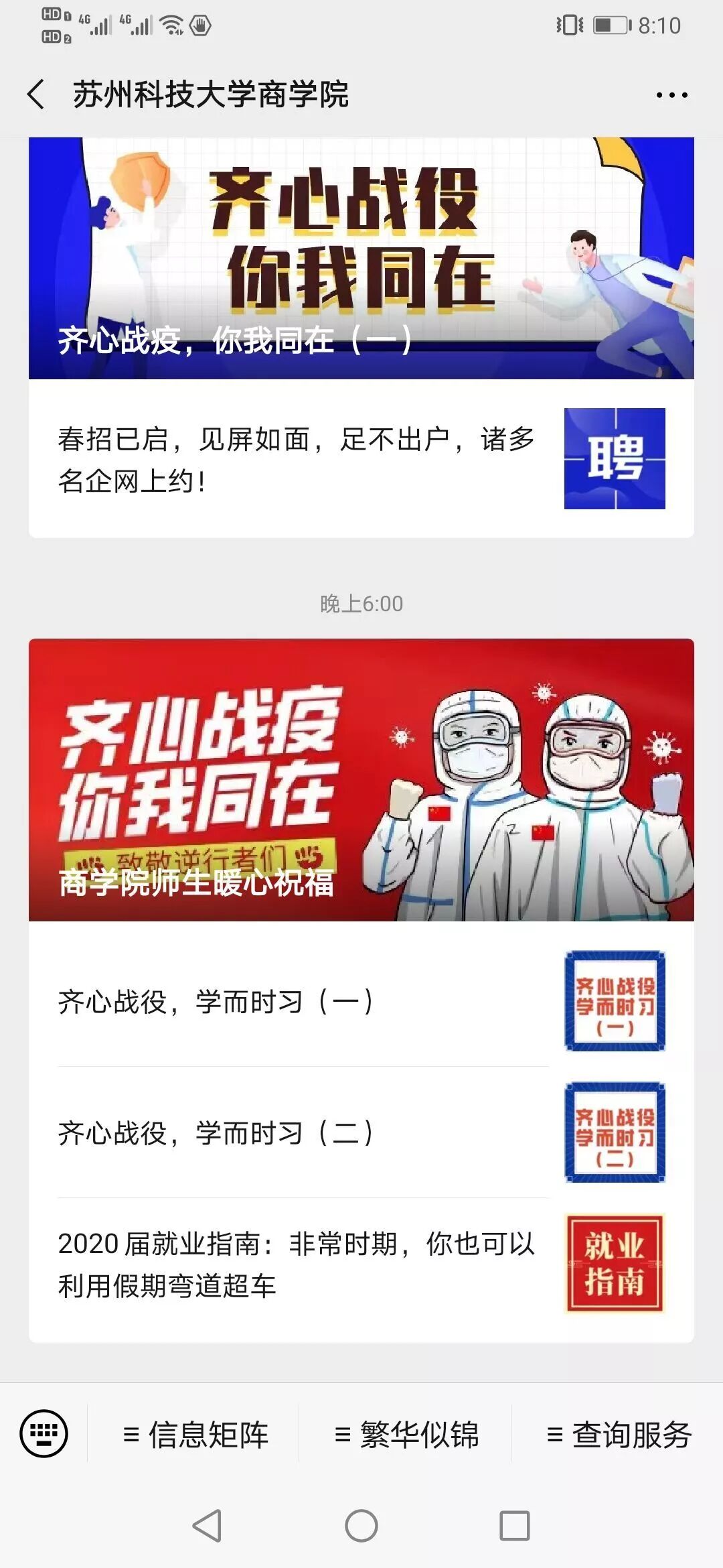 搜集同学们抗击疫情的故事,通过学院官方微信公众号进行推送,增强同学们抗击疫情的信心。