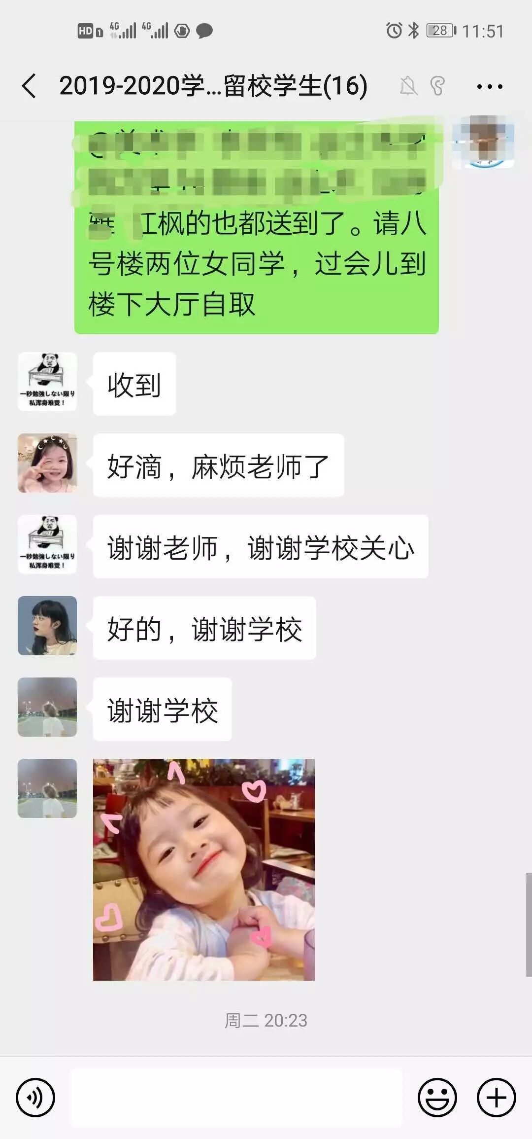 为留校学生送上水果、食品等慰问品,给学生送去温暖。建立留校学生微信群,辅导员每天与学生保持联系,了解学生思想状况,严格落实“日报告、零报告”制度。