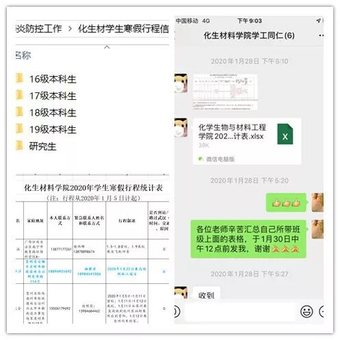 在各个班级群普及新冠肺炎知识,提高学生们的防疫意识,对全院学生逐一进行摸排,详细填写去向统计表,精准掌握学生动向,对于滞留、到访过重点疫情防控地区、与重点疫情防控地区人员或确诊病例有接触史的学生,打一通电话,发一条QQ消息是每日的“必做功课”。