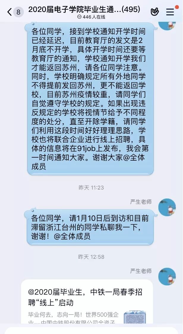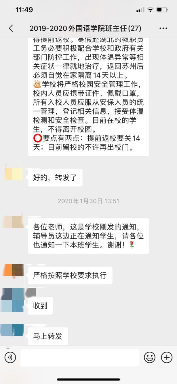我院辅导员已在各年级学生群进行疫情防护宣传引导,并多次转发教育部、省教育厅以及学校发布的各项通知和倡议书。