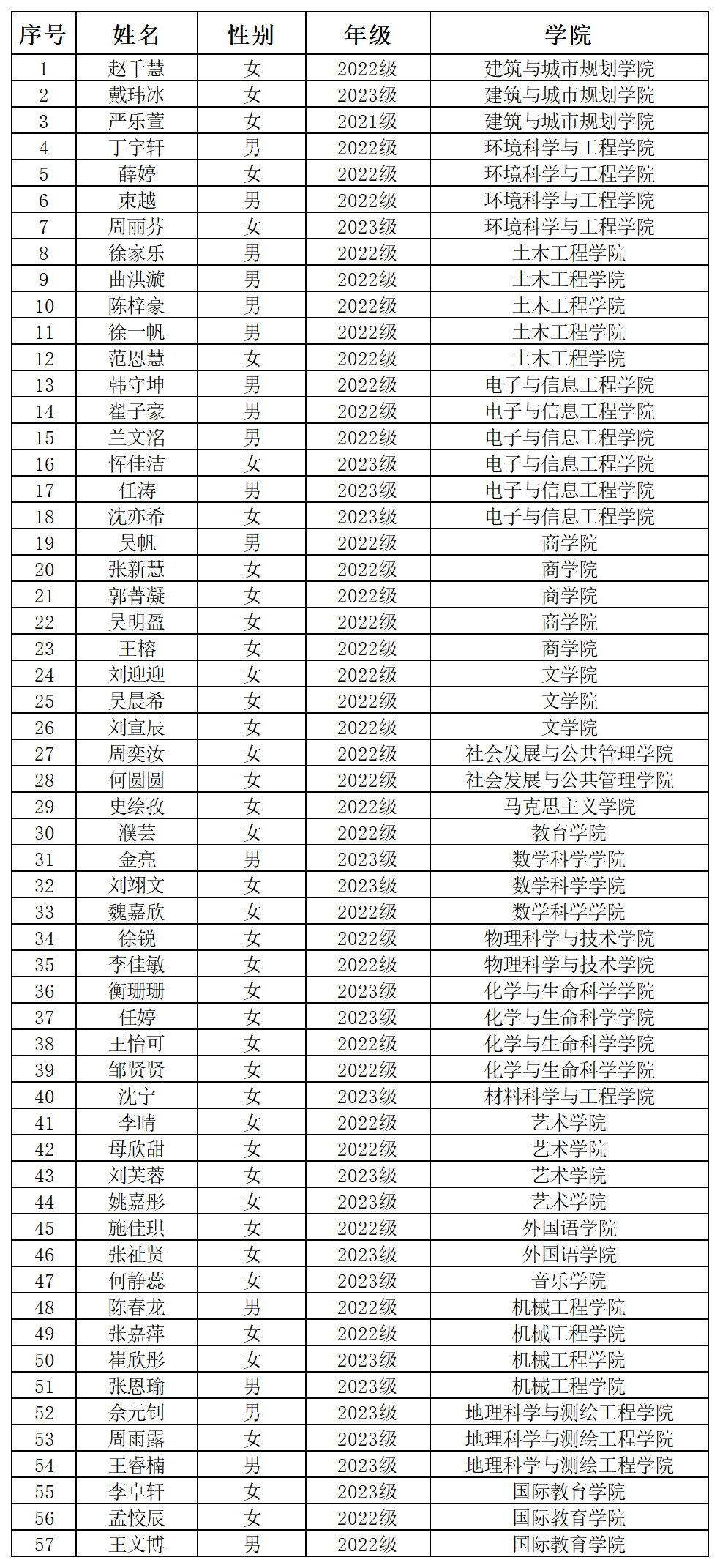 根据《省教育厅关于做好2025年普通高校国家奖学金国家励志奖学金有关工作的通知》(苏教助函〔2025〕5号)、《苏州科技大学本科生国家奖学金评定细则》的相关规定,经个人申请、学院初审、校级评审、校长办公会审定通过,我校57名学生拟获2025年本科生国家奖学金,现公示如下: