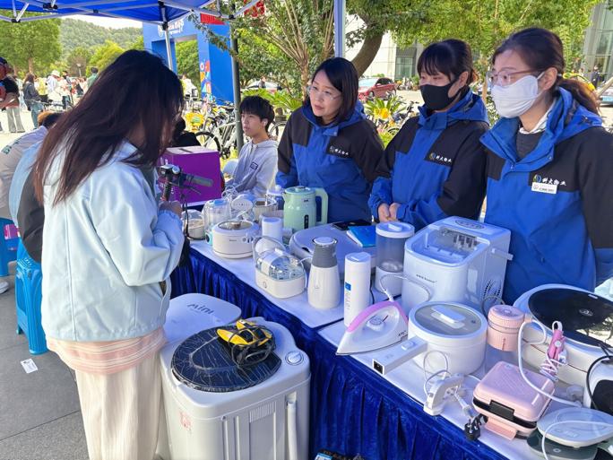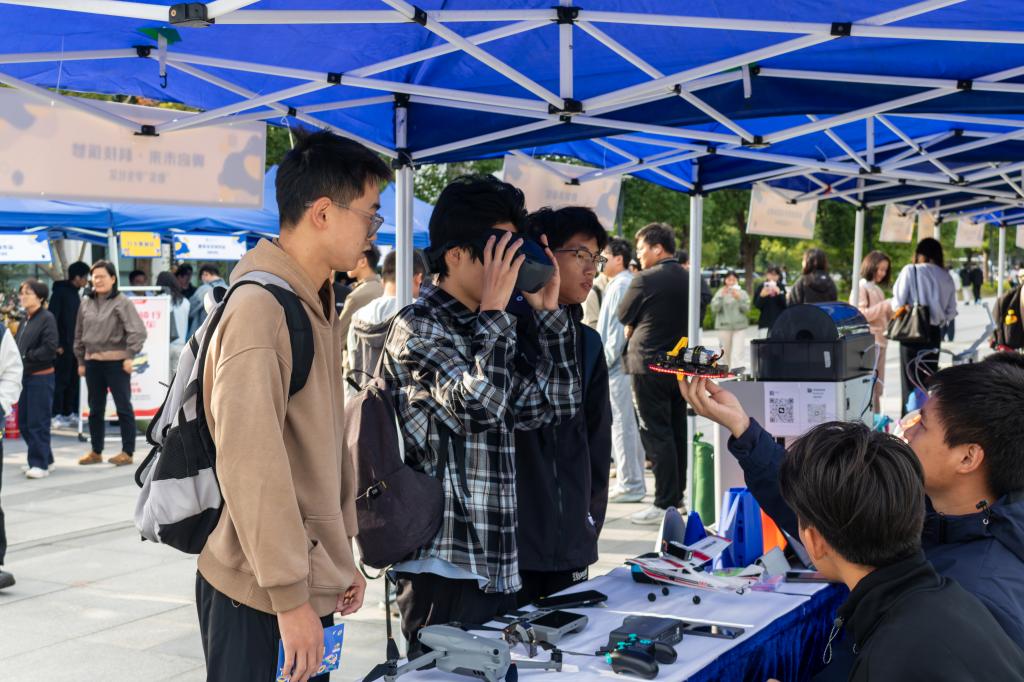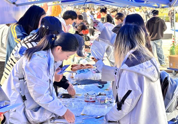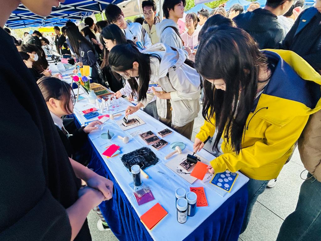 多元活动精彩纷呈,社区文化活力尽显。思政文化区开展了青马知识竞赛,以及掐丝珐琅、投壶、剪纸等非遗项目体验;美育区提供植物拓印等创作体验,科创区则设有智能机器人等互动项目。同学们手持打卡券在各点位间穿梭,完成集章任务后可参与现场抽奖,广场上气氛活跃。